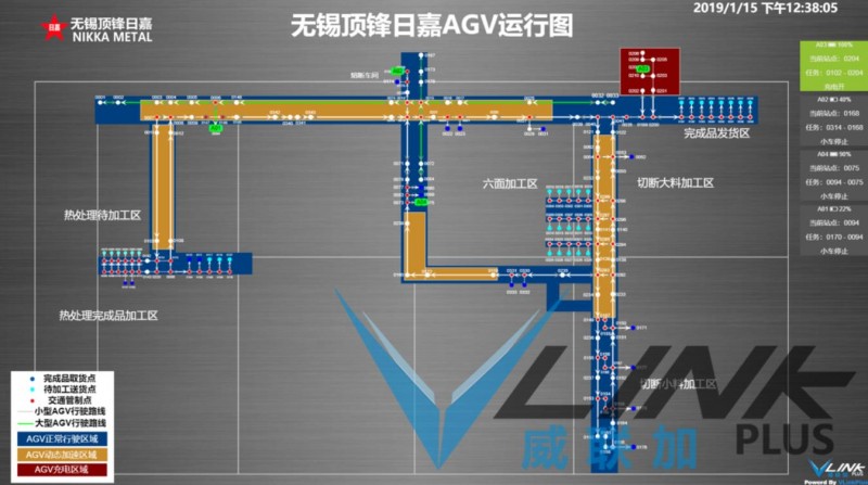 無錫頂鋒日嘉為提高物料和在制品的流轉速度,要求物料及在制品的運輸全面采用AGV調度系統自動運輸。通過威聯加AGV智能調度系統的實施,實現AGV運輸的靈活調度和線路優化,大幅度提升物流的效率,實現快速精準運輸。路線設計根據現場狀況設計3種類型的行駛路線:AGV正常行駛區域、AGV動態加速區域、AGV充電區域,在行駛的路線上通過各節點的不同功能指導小車的行駛路線。