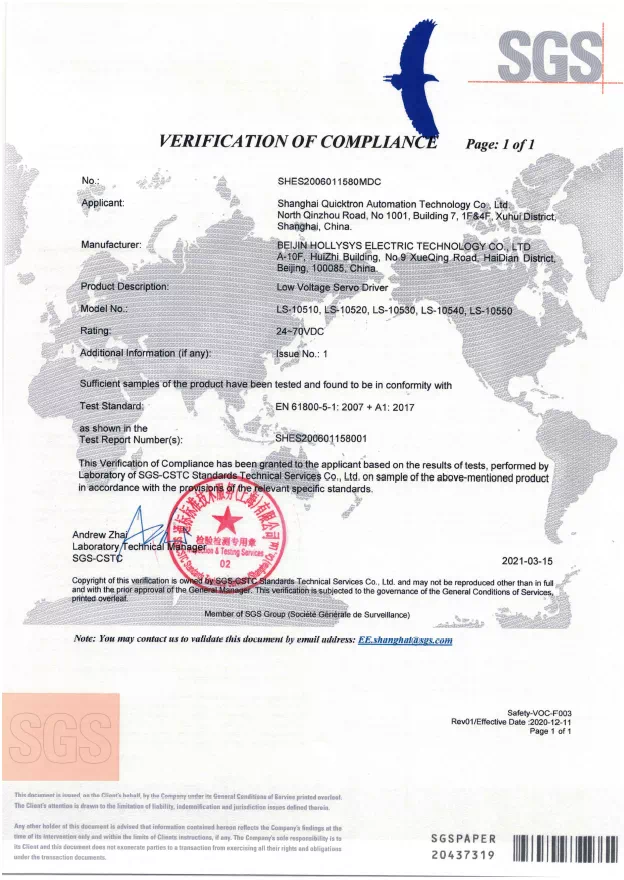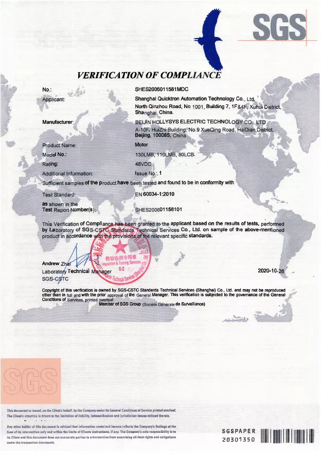 SGS是全球領(lǐng)先的檢驗(yàn)、鑒定、測(cè)試和認(rèn)證機(jī)構(gòu),是全球公認(rèn)的質(zhì)量和誠(chéng)信基準(zhǔn)。SGS作為國(guó)際權(quán)威認(rèn)證機(jī)構(gòu)為和利時(shí)電機(jī)產(chǎn)品頒發(fā)CE證書(shū)和RoHS證書(shū),是對(duì)和利時(shí)電機(jī)技術(shù)實(shí)力的專業(yè)背書(shū),增強(qiáng)了和利時(shí)電機(jī)產(chǎn)品在國(guó)際市場(chǎng)的品牌力,也助力設(shè)備制造商加速全球化步伐。