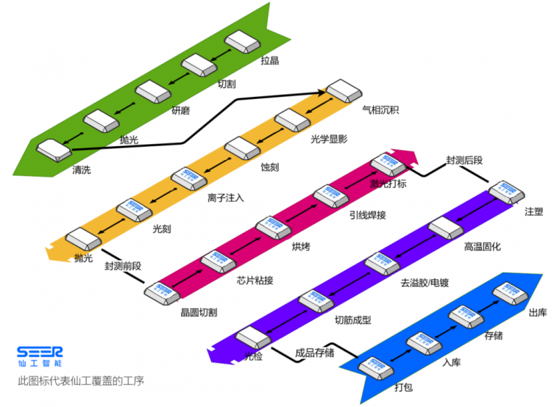 仙工智能經過多年的耕耘,已經覆蓋了半導體行業制程工序的絕大部分工序,從 IC 制造到 IC 封測的工序間物料到成品和原材料的存儲和出入庫等傳統物流工序都有覆蓋。今天分享的就是其中的晶圓處理制程。