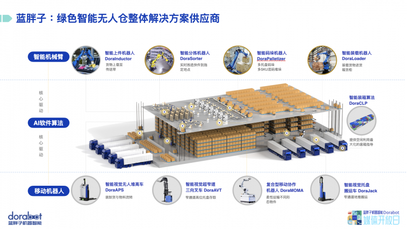 上件機器人DoraInductor、分揀機器人DoraSorter、包裝機器人DoraPacker、復(fù)合型移動協(xié)作機器人DoraMOMA等智能機器人齊上陣,讓人眼前一亮。值得一提的是,藍胖子裝載機器人DoraLoader也在媒體開放日上首度曝光,將在不久的未來落地實際應(yīng)用。