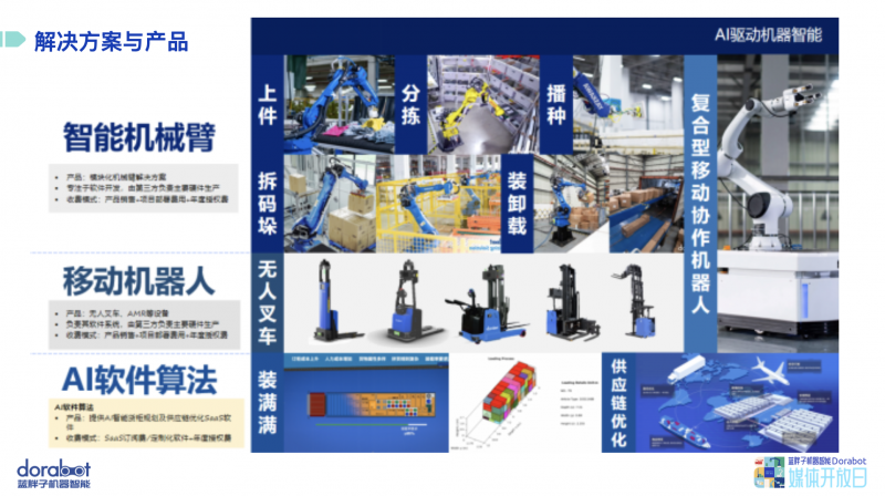 藍胖子產(chǎn)品主要包括軟硬件相結(jié)合的上件機器人、分揀機器人、無人叉車、拆碼垛機器人、裝卸載機器人等,并積累了多種規(guī)劃及優(yōu)化算法,包括智能裝箱算法、智能調(diào)度算法以及多機規(guī)劃算法。