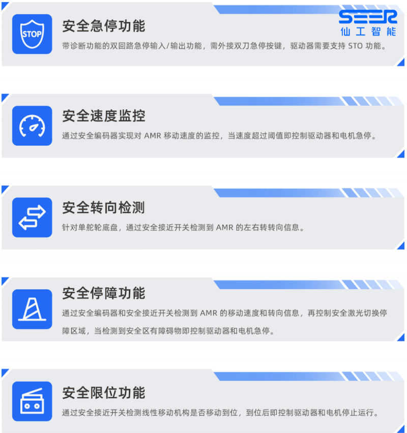 仙工智能以智能控制器和數(shù)字化軟件為核心的產(chǎn)品組合中,將安全作為第一要義,從產(chǎn)品研發(fā)到產(chǎn)品測試到最終交付,始終貫徹安全守護課題,為客戶打造更安全的 AMR。