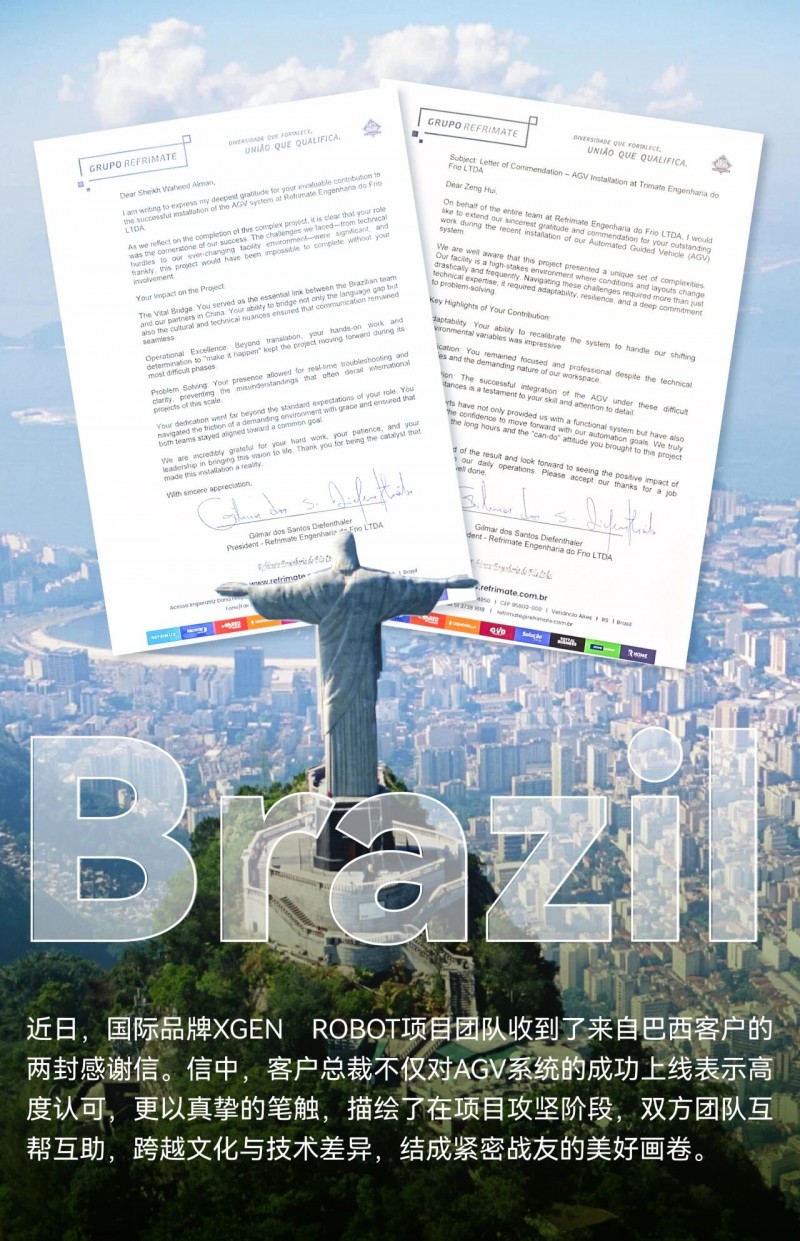這兩封來(lái)自巴西項(xiàng)目的感謝信,不僅是對(duì)一次技術(shù)交付的肯定,更是對(duì)公司“以客戶(hù)為中心”服務(wù)模式的信任背書(shū),是XGEN ROBOT在全球智慧物流領(lǐng)域深耕的縮影。未來(lái),XGEN ROBOT將以更專(zhuān)業(yè)的技術(shù)支持、更深度的客戶(hù)協(xié)同和更細(xì)致的價(jià)值陪伴,在全球范圍內(nèi),書(shū)寫(xiě)一個(gè)又一個(gè)關(guān)于信任、挑戰(zhàn)與共贏的故事。