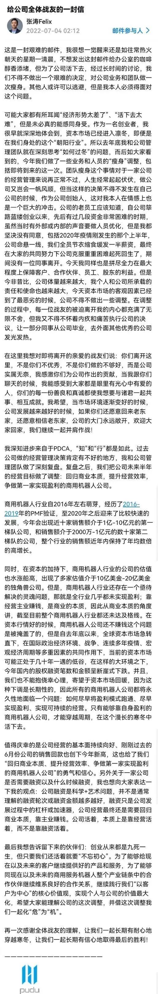 7月4日凌晨,普渡科技CEO張濤發(fā)全員信,稱為了公司活下去,經(jīng)過長時(shí)間的討論,不得不做出一個(gè)艱難的決定,對公司業(yè)務(wù)和團(tuán)隊(duì)做一次瘦身。