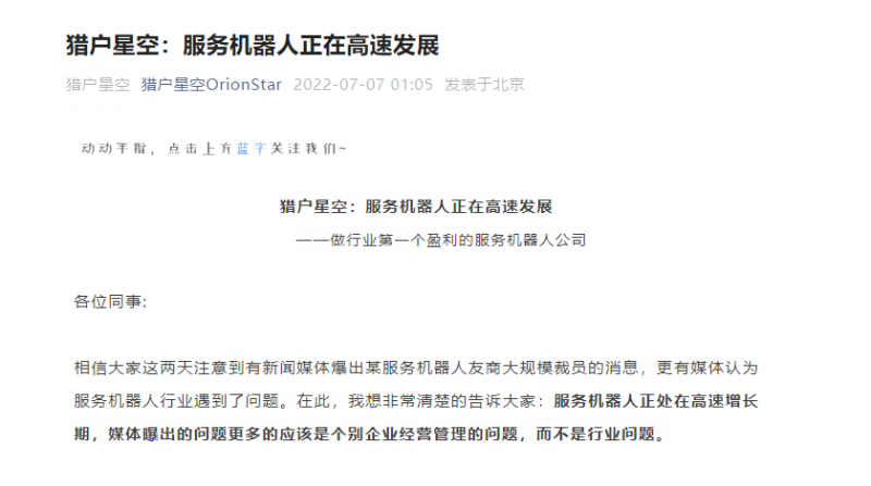 7月7日凌晨,獵戶星空在其官方公眾號上發(fā)文稱:服務(wù)機(jī)器人正處在高速增長期,媒體曝出的問題更多的應(yīng)該是個(gè)別企業(yè)經(jīng)營管理的問題,而不是行業(yè)問題。