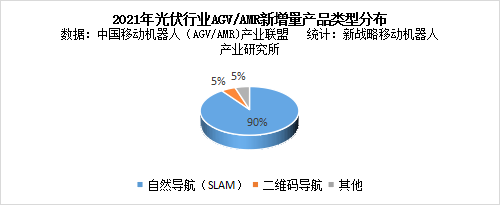 根據中國移動機器人(AGV/AMR)產業聯盟數據、新戰略移動機器人產業研究所統計顯示,2021年光伏行業新增AGV/AMR中,自然導航(SLAM)占比超過90%;其次是二維碼導航,占比約為5%;其他約為5%。目前光伏行業呈現出技術快速迭代的現狀,柔性化、定制化、快速更新是行業發展的趨勢,對設備的柔性化要求很高,因此,當前光伏工廠所應用AGV/AMR基本以自然導航(SLAM)產品為主。