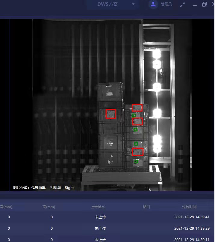 華睿科技通過追蹤讀碼相機(jī)畫面內(nèi)貨物的移動(dòng),將所有相機(jī)采集的圖片進(jìn)行標(biāo)定、對(duì)比、融合,完整展示堆垛貨物讀碼情況。通過大景深相機(jī)融合先進(jìn)拼圖算法, AGV在不同位置通過時(shí),可精確計(jì)算不同相機(jī)之間的重合區(qū)域,進(jìn)行準(zhǔn)確的多相機(jī)拼接。通過先進(jìn)的深度學(xué)習(xí)面單檢測(cè)技術(shù),實(shí)現(xiàn)讀碼/未讀碼條碼的綁定框選,針對(duì)未讀碼紅框標(biāo)記,配合大屏清晰顯示,便于工人進(jìn)行條碼補(bǔ)錄,防止貨物漏檢。