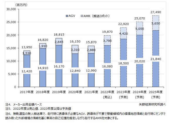AGV在日本80年代就得到了廣泛應用,1981年,日本的AGV總產值為60億日元,1985年已上升到200億日元,平均每年以20%的速度遞增,1986年,日本累計安裝了2312個AGVS,擁有5032臺AGV,到1990年日本擁有AGV約一萬臺。到1988年,日本AGV制造廠已達47家,一路發展,日本的AGV在2002到2003年達到應用的頂峰。而根據矢野經濟研究所公布的對日本AGV/AMR(運輸機器人)市場的最新調查結果顯示,日本AGV/AMR的市場規模(制造商出貨量)在2020財年為7055臺(同比下降6.7%),為161.5億日元(同比下降14.2%),21財年為6400臺(同比下降9.3%),為158.7億日元(同比下降1.7%),連續第二年低于上一財年。雖然2020財年由于新產品推出等原因產生了推動作用,但由于新冠狀病毒感染的蔓延,經濟活動等前景不明朗,用戶企業暫時凍結資本投資的情況十分明顯,導致整體市場下降。在21財年,由于半導體短缺,產品出貨量受到嚴重限制,加上日冕效應長期存在,導致上一財年出現負增長。預計22財年日本AGV/AMR的市場規模(制造商出貨量)為7700臺(同比增長20.3%),銷售額為198.7億日元(同比增長25.2%)。雖然半導體短缺的影響仍在繼續,但制造商在前一年努力改善和加強供應系統是積極因素,預計三年來首次出現增長。