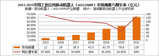 2015-2021中國市場企業工業應用移動機器人(AGV/AMR)新增量(臺)與增長率