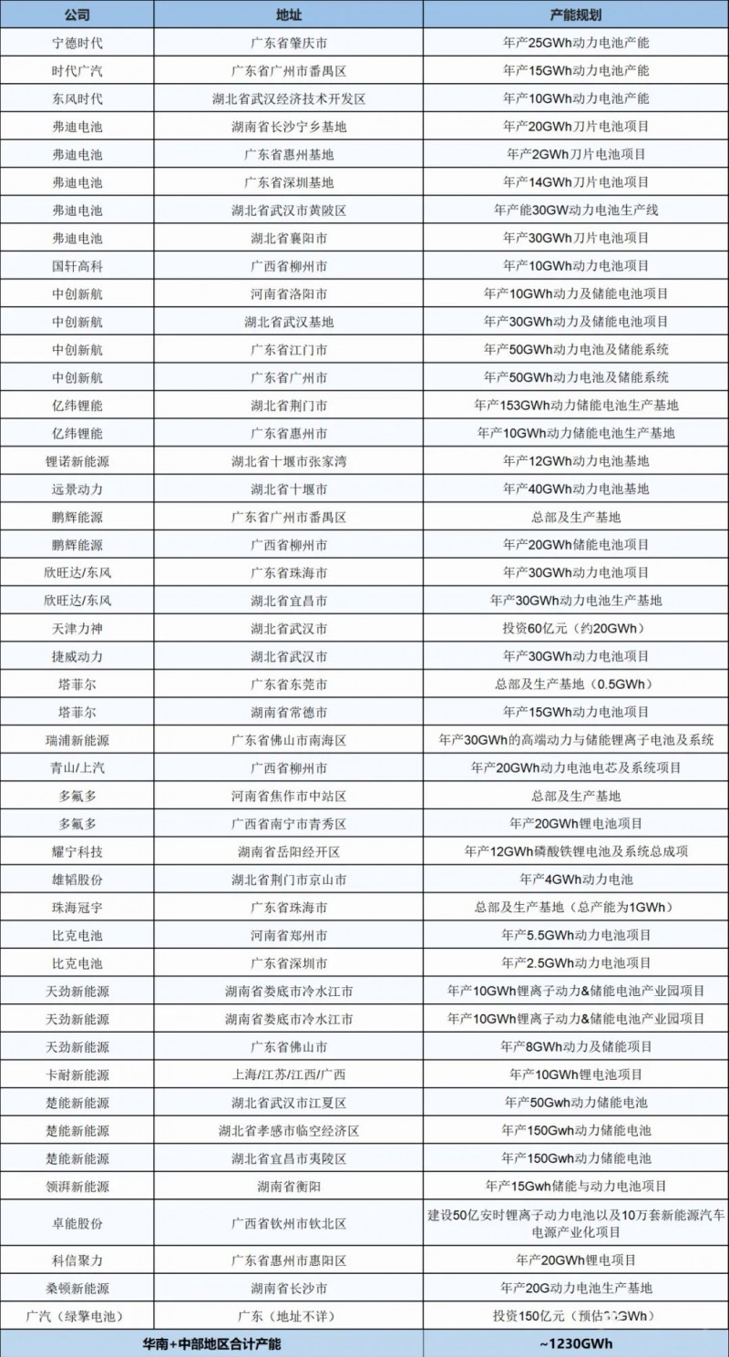 全國動力與儲能電池基地產能統計表3---華南+中部地區
