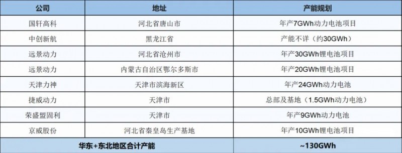 全國動力與儲能電池基地產能統計表2---華北+東北地區
