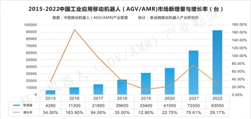 2015-2022中國工業(yè)應(yīng)用移動機器人(AGV/AMR)新增量與增長率