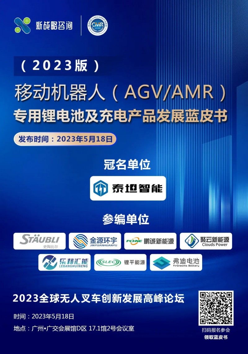 為了更好地解讀當(dāng)前AGV/AMR市場鋰電池及充電產(chǎn)品相關(guān)應(yīng)用情況及趨勢,5月18日,由CMR產(chǎn)業(yè)聯(lián)盟及新戰(zhàn)略移動機器人產(chǎn)業(yè)研究所主編,廣東泰坦智能動力有限公司冠名發(fā)布,史陶比爾(杭州)精密機械電子有限公司、河南金源環(huán)宇儲能技術(shù)有限公司、深圳市鵬誠新能源科技有限公司、蘇州聚云新能源科技有限公司、樂邦新能源(天津)有限公司、上海鋰平能源科技有限公司、深圳比亞迪鋰電池有限公司/弗迪電池等企業(yè)聯(lián)合參編的《移動機器人(AGV/AMR)專用鋰電池及充電產(chǎn)品發(fā)展藍(lán)皮書(2023版)》將在“2023全球無人又車創(chuàng)新發(fā)展高峰論壇”上正式發(fā)布!敬請期待!