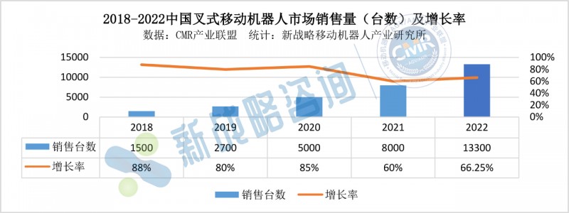 據(jù)CMR產(chǎn)業(yè)聯(lián)盟數(shù)據(jù)、新戰(zhàn)略移動機(jī)器人產(chǎn)業(yè)研究所統(tǒng)計(jì),2022年中國叉式移動機(jī)器人銷量達(dá)13300臺,同比增長66.25%,市場規(guī)模約為34.68億元,同比增長41.55%。