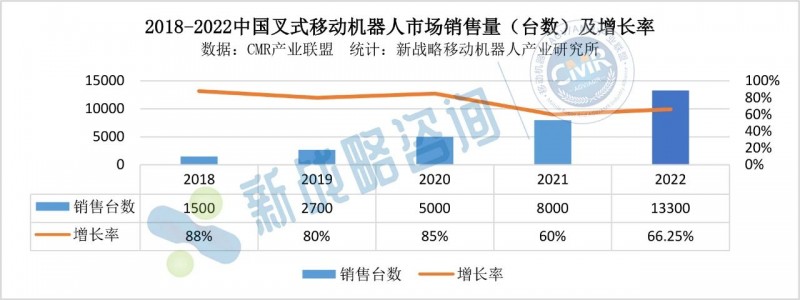 據CMR產業聯盟數據、新戰略移動機器人產業研究所統計,2022年中國叉式移動機器人銷量達13300臺,同比增長66.25%,市場規模約為34.68億元,同比增長41.55%,市場增速明顯。
