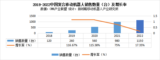根據CMR產業聯盟數據,新戰略移動機器人產業研究所統計, 2022年度中國市場新增復合移動機器人1150臺,從2018年的120臺到2022超千臺,近年來復合機器人落地應用逐漸增多。