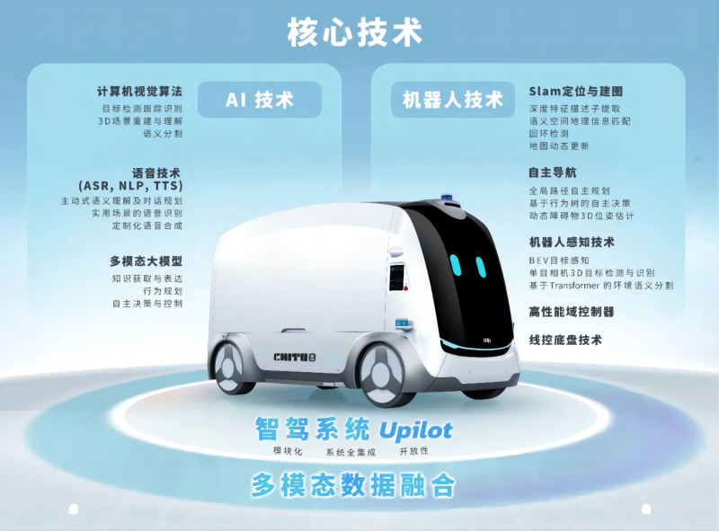 據(jù)了解,Chitu赤兔還搭載了UQI優(yōu)奇自主研發(fā)的智能駕駛系統(tǒng)Upilot,并融合計(jì)算機(jī)視覺(jué)算法、語(yǔ)音技術(shù)、多模態(tài)大模型、SLAM定位與建圖、自主導(dǎo)航、高精度感知等“AI+機(jī)器人”技術(shù),達(dá)到國(guó)內(nèi)先進(jìn)的L4級(jí)無(wú)人駕駛技術(shù)水平。