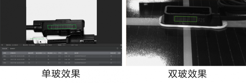 需求:電池片敷設(shè)背板或背玻后,表面會貼附標簽碼用于后續(xù)工序的追溯管理,單玻組件貼在背板上,雙玻組件貼在毛玻璃上,需要在組件運轉(zhuǎn)過程中讀碼。