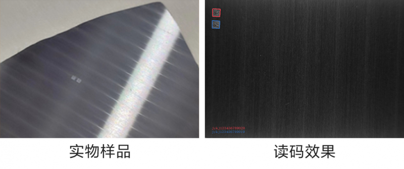 需求:光伏硅片生產(chǎn)的質(zhì)量追溯,硅片上激光鐳雕的極小碼讀取,碼大小0.6*0.6mm,通過刻印兩個二維碼增加識別率,安裝空間180mm以內(nèi)。