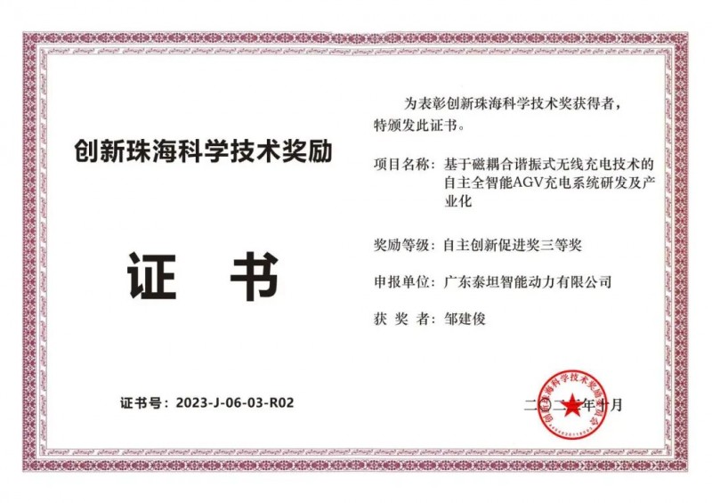 讓我們共同祝賀廣東泰坦智能動(dòng)力有限公司獲得2023年度創(chuàng)新珠海科學(xué)技術(shù)獎(jiǎng)-自主創(chuàng)新促進(jìn)獎(jiǎng)三等獎(jiǎng)以及2023年度珠海市科技創(chuàng)新產(chǎn)品獎(jiǎng),并期待我們未來(lái)在新能源領(lǐng)域繼續(xù)取得更多突破和成就!