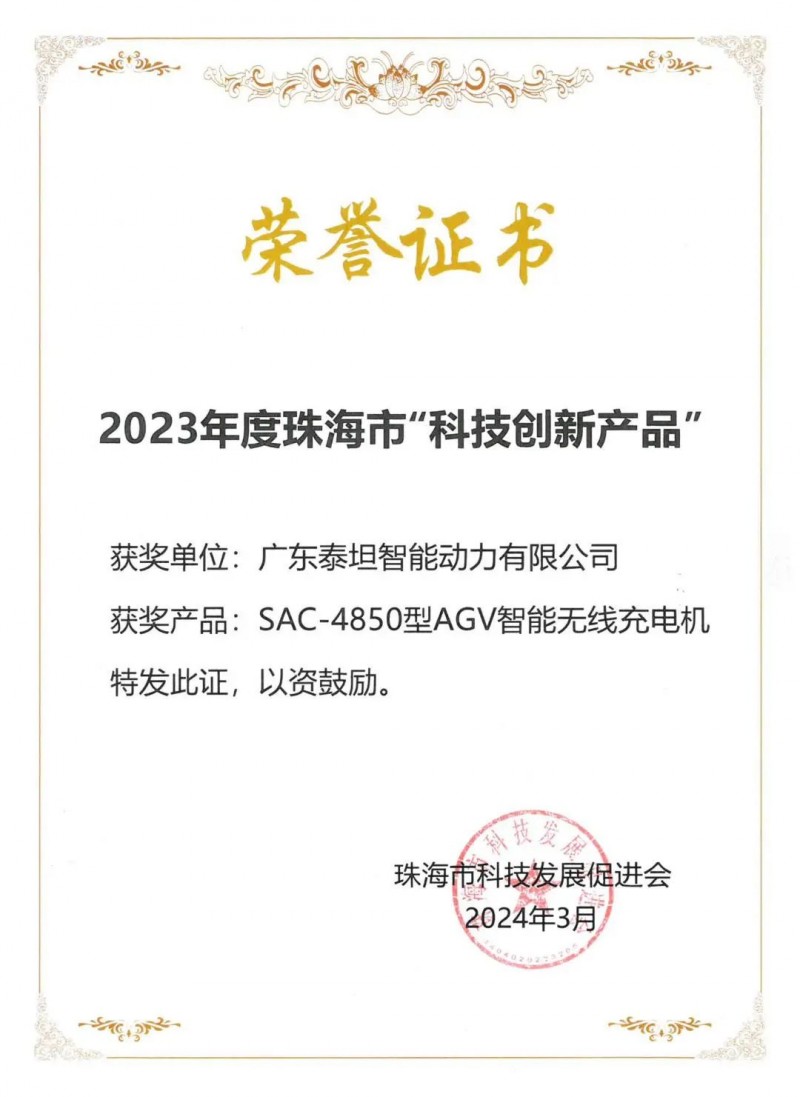 3月29日下午,“創(chuàng)新珠海”科技獎(jiǎng)暨科技創(chuàng)新評(píng)優(yōu)頒獎(jiǎng)典禮在珠海舉行。來(lái)自市科技創(chuàng)新局、市工業(yè)和信息化局、市民政局、市科協(xié)等有關(guān)部門負(fù)責(zé)人,企業(yè)、高校、科研院所和社會(huì)組織代表共計(jì)200余人參會(huì)。廣東泰坦智能動(dòng)力有限公司憑借其基于磁耦合諧振式無(wú)線充電技術(shù)的自主全智能AGV充電系統(tǒng)研發(fā)及產(chǎn)業(yè)化項(xiàng)目獲得了2023年度珠海科學(xué)技術(shù)獎(jiǎng)-自主創(chuàng)新促進(jìn)獎(jiǎng)三等獎(jiǎng)以及2023年度珠海市科技創(chuàng)新產(chǎn)品獎(jiǎng)。