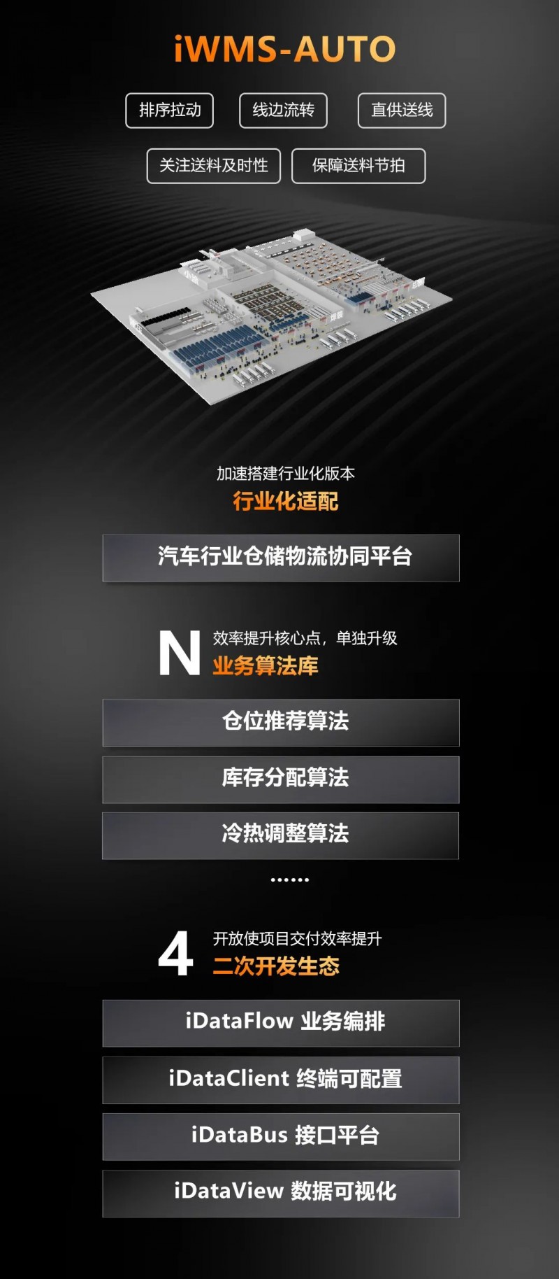 針對汽車行業(yè)特性打造的倉儲物流協(xié)同平臺,通過排序拉動、線邊流轉(zhuǎn)、直供送線等方式保障每個工位的送料節(jié)拍。