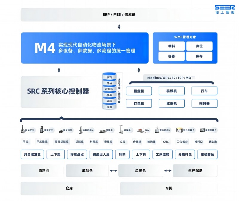 M4 集成 RCS、WCS、WMS 功能于一身,一體化管理解決機器人管理與運單管理問題、各類與機器人配合作業(yè)的自動化設(shè)備管理問題、入庫出庫等倉儲業(yè)務(wù)問題,降低系統(tǒng)對接及維護成本,打破多系統(tǒng)間的數(shù)據(jù)孤島。