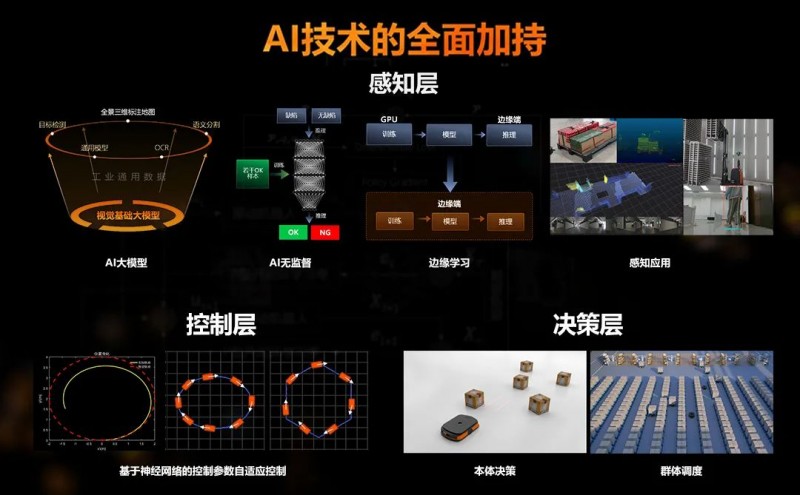 賈永華也提到感知智能的重要性:“正如人的眼睛一樣,未來,我們要給工業制造裝上更多的‘眼睛’,賦予機器感受外部世界的能力,這是機器人理解和執行任務前提。”海康機器人圍繞機器視覺應用特點,近年來重點研究了AI小樣本學習,無監督學習以及行業大模型等技術難題,推出了10多項AI算法工具,積極推進AI+機器視覺在更多行業的滲透應用;同時海康機器人將AI算法和經典算法相結合,推出了AI模板匹配、AI讀碼、邊緣學習等特殊算法,部分讀碼相機已能實線上千幀的讀碼和分析。并在環境標注方面,基于大模型的特征,海康機器人構建了全景的三維的標注地圖,通過這樣的方式,海康機器人有效提升了建圖定位、點云識別、視覺標識檢測等多種環境感知的識別精度,使機器對世界的認識更全面。“在控制層面,我們基于模型的最優控制,運行規劃消除偏差,通過迭代學習,使機器人逐漸適應各種環境,未來其適應能力會越來越強,可以提升控制的自主性和魯棒性。而在當前的決策層面,我們基于AI路徑規劃能力,通過大量規劃路徑數據的學習,使網絡具備專家級的路徑規劃能力。同時利用網絡推理并進行預算,實現半徑毫秒級的快速路程規劃。”賈永華表示,在AI的加持下,極大地增強了智能系統生產能力,這種能力不斷滲透到各個場景、業務和行業,可以有效地將AI技術真正轉變為生產力。