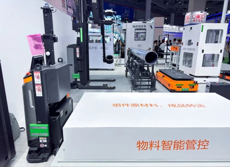 組件環節展示的是叉取AMR搬運托盤,對應組件工廠中的玻璃、EVA、電池片等原材料及成品轉運。展示的叉取AMR可轉運3T的物料,托盤長度可達2.5m,叉取AMR兼容多種規格托盤,且自動對接玻璃機、分檔機、包裝線等產線機臺。