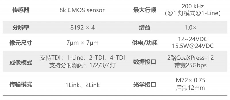 相機搭配兩路CoaXPress-12數據接口,總帶寬25Gbps,滿分辨率下最大行頻可達200kHz,可快速捕捉圖像,傳輸大量圖像數據,匹配大部分高速檢測需求。