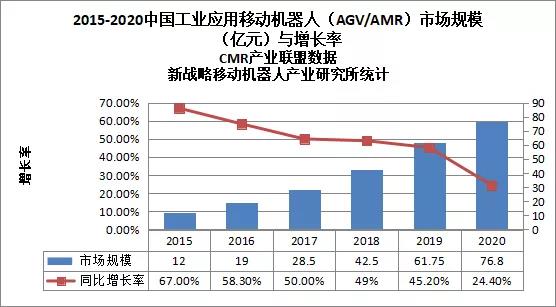 圖表:2015-2020中國工業(yè)應(yīng)用移動機器人(AGV/AMR)市場規(guī)模(億元)與增長率