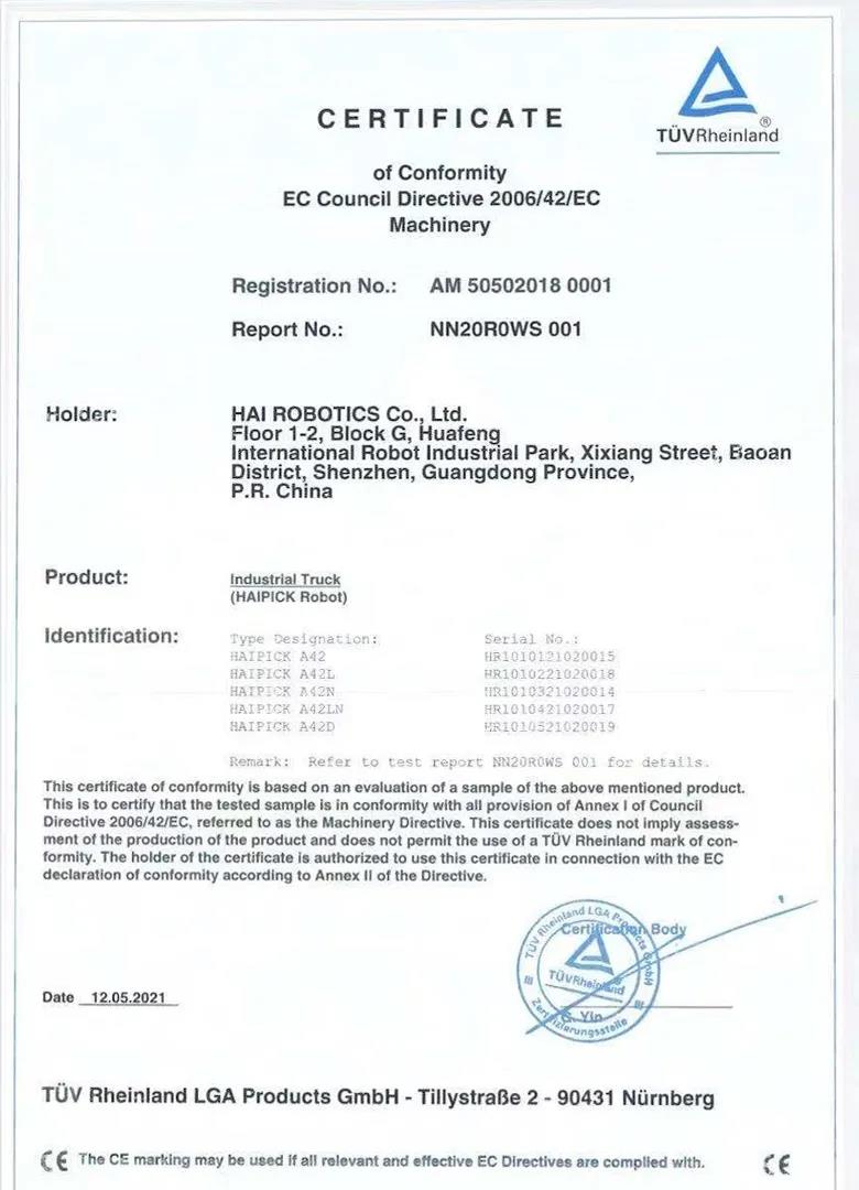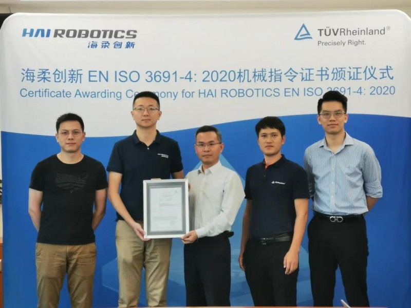 2021年5月21日,權威認證機構德國萊茵TüV大中華區(以下簡稱“TüV萊茵”)向海柔創新自主研發的箱式倉儲機器人產品——庫寶系列機器人(HAIPICK A42/A42D/A42N)頒發了EN ISO 3691-4:2020機械指令證書。