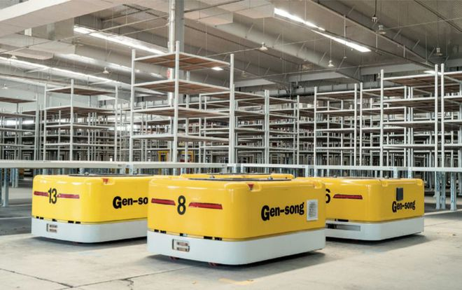 合肥井松為上汽通用東岳打造的倉儲項目,整個倉庫共有貨架956個,每個貨架5層,可以存放料箱34416個,貨物種類與吞吐流量極為龐大。井松為倉庫布置了21臺視覺紋理導航機器人來實現(xiàn)整個倉庫的自動化搬運,通過中央調(diào)度系統(tǒng)進行智能分析,合理調(diào)配每一臺機器人完成各種物料的進出。