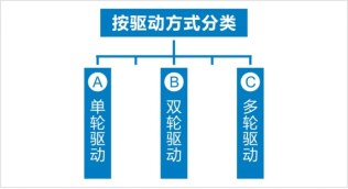 按照驅動方式分,可分為單輪驅動、雙輪驅動、多輪驅動。