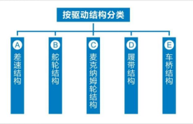 按驅動結構分,可分為差速結構、舵輪結構、麥克納姆輪型結構、履帶結構、車橋結構等。